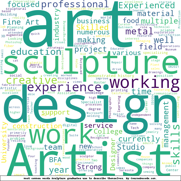 Here is a visual representation of the most common words seen in the "about" section of LinkedIn profiles who have a Bachelor degree in Sculpture. This may or may not be useful: