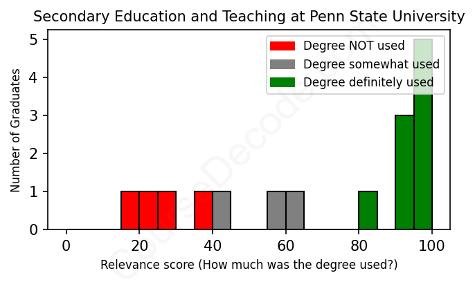 The verdict? Slightly above average. Overall, with an average relevance score of 70%, Secondary Education and Teaching graduates from Penn State University have a slightly higher likelihood (+3%) of finding work in this field compared to the average graduate across all fields: