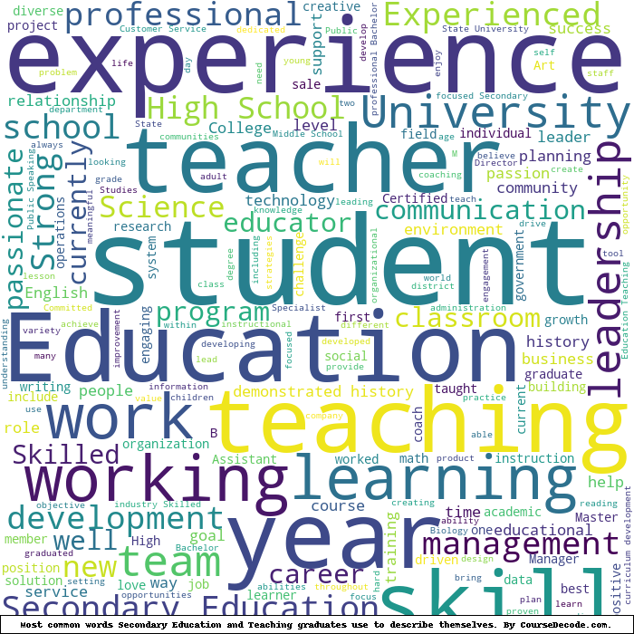 Here is a visual representation of the most common words seen in the "about" section of LinkedIn profiles who have a Bachelor degree in Secondary Education and Teaching (this is across all Secondary Education and Teaching graduates we've analyzed, not just those who went to Penn State University). This may or may not be useful: