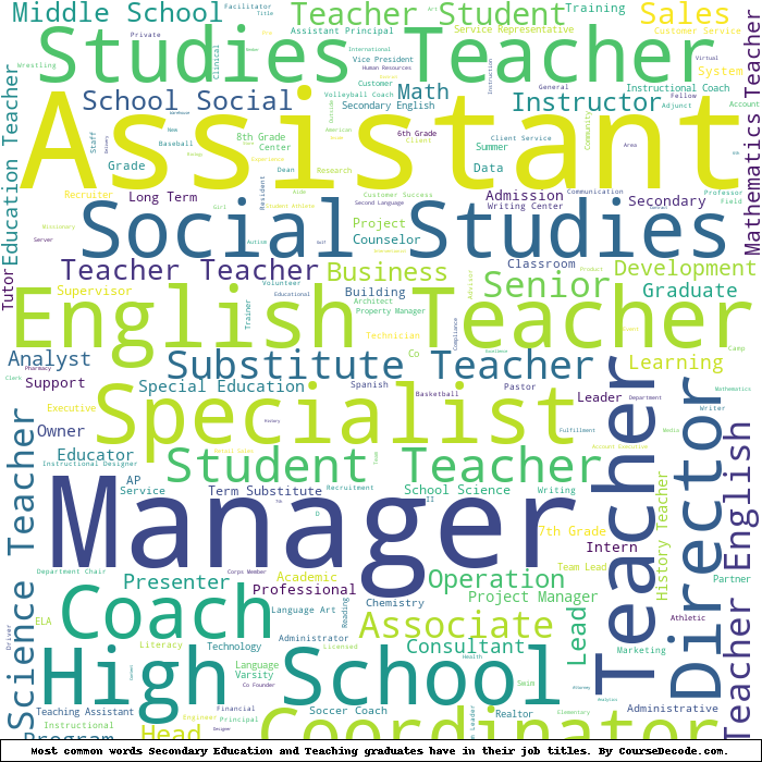 Here is a visual representation of the most common words in job titles for Secondary Education and Teaching graduates (this is across all Secondary Education and Teaching graduates we've analyzed, not just those who went to Penn State University):