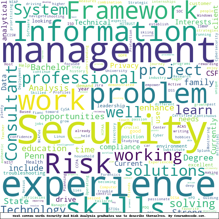 Here is a visual representation of the most common words seen in the "about" section of LinkedIn profiles who have a Bachelor degree in Security And Risk Analysis (this is across all Security And Risk Analysis graduates we've analyzed, not just those who went to Penn State University). This may or may not be useful: