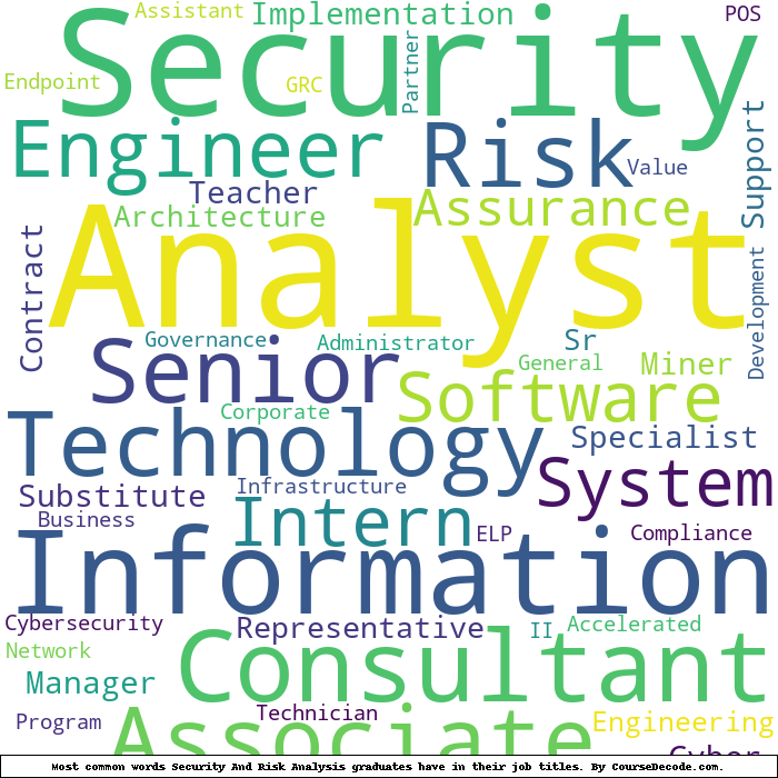 Here is a visual representation of the most common words in job titles for Security And Risk Analysis graduates (this is across all Security And Risk Analysis graduates we've analyzed, not just those who went to Penn State University):