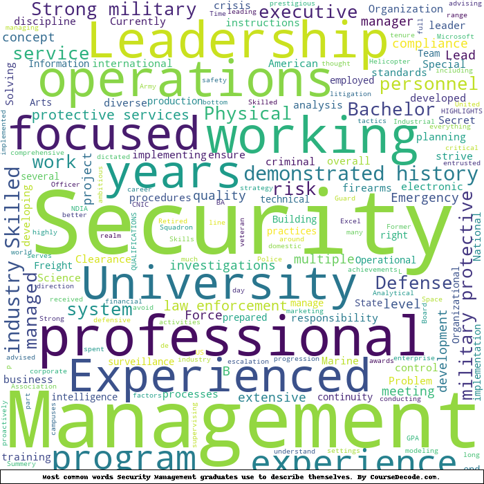 Here is a visual representation of the most common words seen in the "about" section of LinkedIn profiles who have a Bachelor degree in Security Management (this is across all Security Management graduates we've analyzed, not just those who went to American Military University). This may or may not be useful: