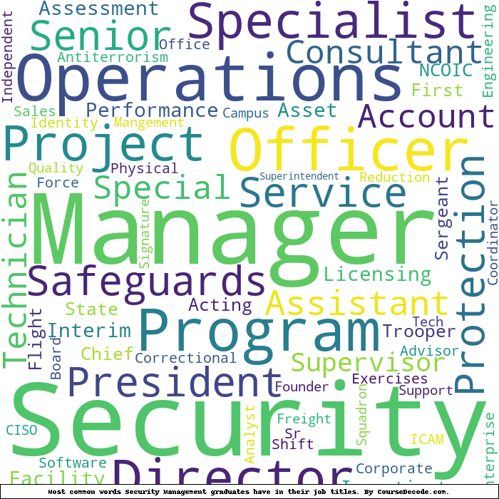 Here is a visual representation of the most common words in job titles for Security Management graduates (this is across all Security Management graduates we've analyzed, not just those who went to American Military University):