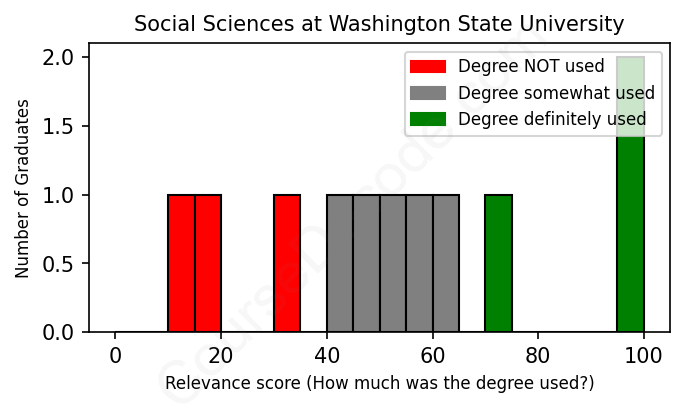 The verdict? Significantly below average. Overall, with an average relevance score of 53%, Social Sciences graduates from Washington State University have a much lower likelihood (-14%) of finding work in this field compared to the average graduate across all fields: