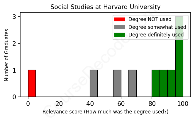 The verdict? Above average. Overall, with an average relevance score of 73%, Social Studies graduates from Harvard University have a higher likelihood (+6%) of finding work in this field compared to the average graduate across all fields: