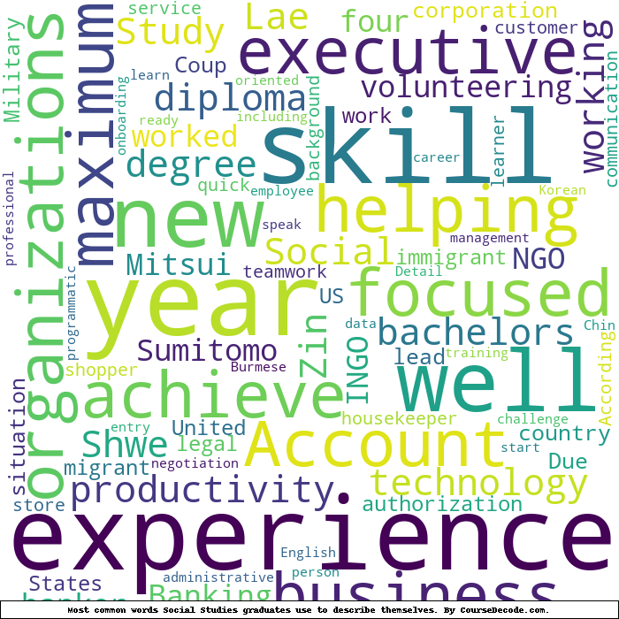 Here is a visual representation of the most common words seen in the "about" section of LinkedIn profiles who have a Bachelor degree in Social Studies (this is across all Social Studies graduates we've analyzed, not just those who went to Harvard University). This may or may not be useful: