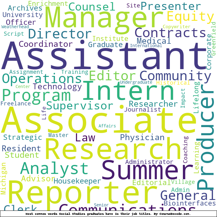 Here is a visual representation of the most common words in job titles for Social Studies graduates (this is across all Social Studies graduates we've analyzed, not just those who went to Harvard University):
