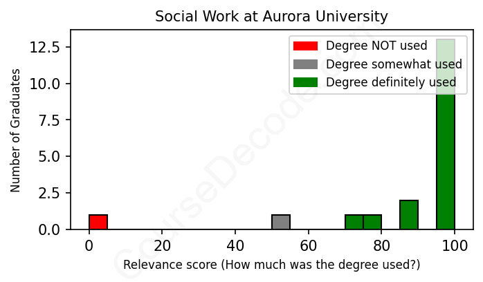 The verdict? Significantly above average. Overall, with an average relevance score of 87%, Social Work graduates from Aurora University have a much higher likelihood (+20%) of finding work in this field compared to the average graduate across all fields: