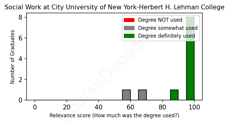 The verdict? Great! Overall, with an average relevance score of 91%, Social Work graduates from City University of New York-Herbert H. Lehman College have a substantially higher likelihood (+24%) of finding work in this field compared to the average graduate across all fields:
