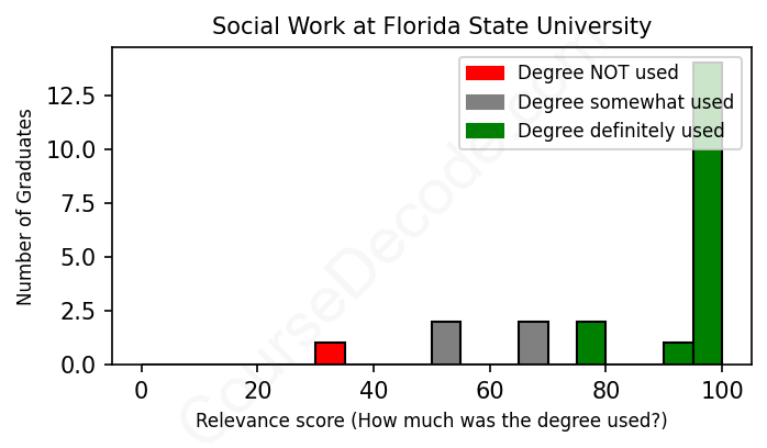 The verdict? Significantly above average. Overall, with an average relevance score of 86%, Social Work graduates from Florida State University have a much higher likelihood (+19%) of finding work in this field compared to the average graduate across all fields:
