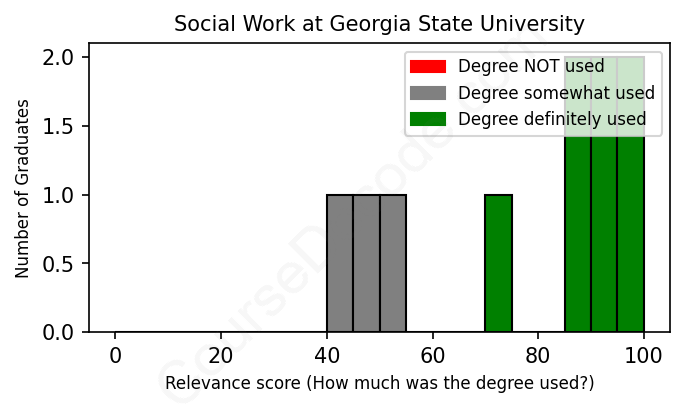 The verdict? Above average. Overall, with an average relevance score of 77%, Social Work graduates from Georgia State University have a higher likelihood (+10%) of finding work in this field compared to the average graduate across all fields: