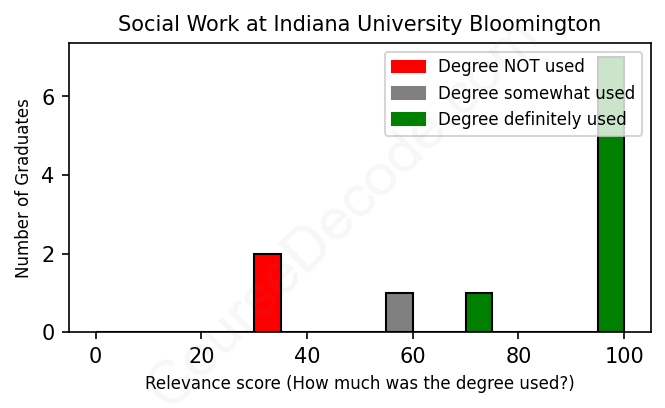The verdict? Significantly above average. Overall, with an average relevance score of 81%, Social Work graduates from Indiana University Bloomington have a much higher likelihood (+14%) of finding work in this field compared to the average graduate across all fields: