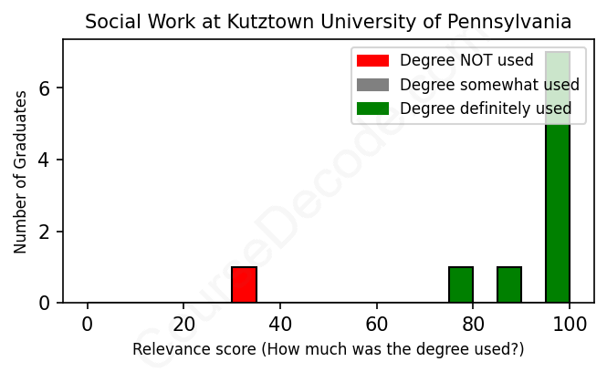 The verdict? Great! Overall, with an average relevance score of 89%, Social Work graduates from Kutztown University of Pennsylvania have a substantially higher likelihood (+22%) of finding work in this field compared to the average graduate across all fields: