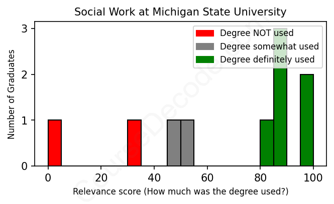 The verdict? On par with the average. Overall, with an average relevance score of 67%, Social Work graduates from Michigan State University have about the same likelihood of finding work in this field as the average graduate across all fields: