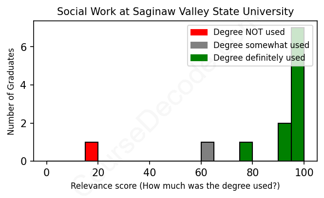 The verdict? Significantly above average. Overall, with an average relevance score of 86%, Social Work graduates from Saginaw Valley State University have a much higher likelihood (+19%) of finding work in this field compared to the average graduate across all fields: