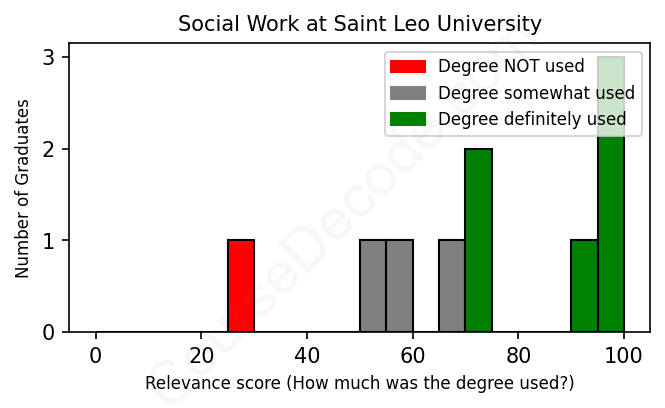 The verdict? Above average. Overall, with an average relevance score of 73%, Social Work graduates from Saint Leo University have a higher likelihood (+6%) of finding work in this field compared to the average graduate across all fields: