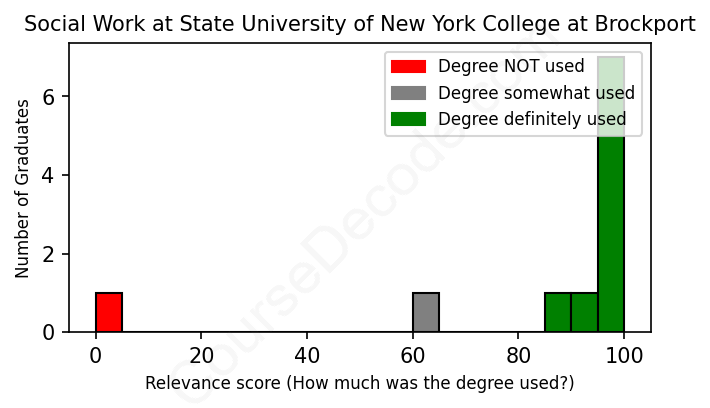 The verdict? Significantly above average. Overall, with an average relevance score of 85%, Social Work graduates from State University of New York College at Brockport have a much higher likelihood (+18%) of finding work in this field compared to the average graduate across all fields: