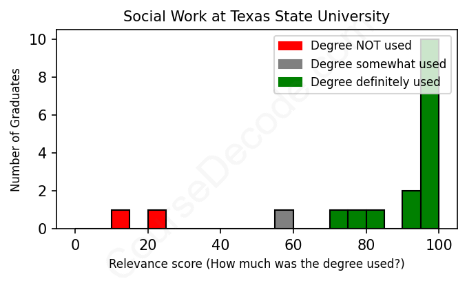 The verdict? Significantly above average. Overall, with an average relevance score of 83%, Social Work graduates from Texas State University have a much higher likelihood (+16%) of finding work in this field compared to the average graduate across all fields: