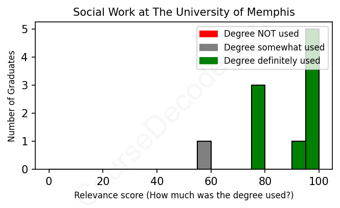 The verdict? Significantly above average. Overall, with an average relevance score of 87%, Social Work graduates from The University of Memphis have a much higher likelihood (+20%) of finding work in this field compared to the average graduate across all fields: