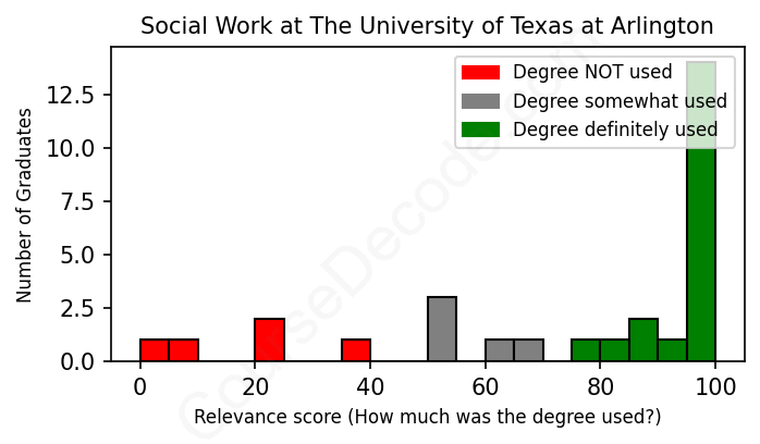 The verdict? Above average. Overall, with an average relevance score of 75%, Social Work graduates from The University of Texas at Arlington have a higher likelihood (+8%) of finding work in this field compared to the average graduate across all fields: