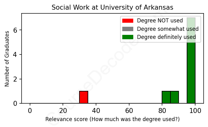 The verdict? Great! Overall, with an average relevance score of 88%, Social Work graduates from University of Arkansas have a substantially higher likelihood (+21%) of finding work in this field compared to the average graduate across all fields: