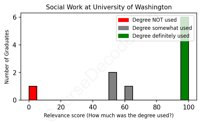 The verdict? Above average. Overall, with an average relevance score of 76%, Social Work graduates from University of Washington have a higher likelihood (+9%) of finding work in this field compared to the average graduate across all fields: