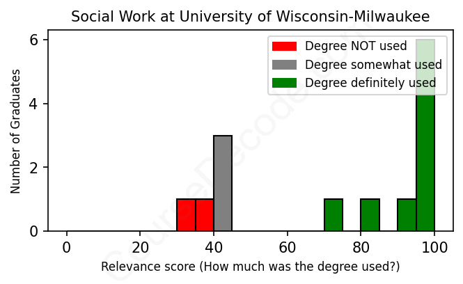 The verdict? Above average. Overall, with an average relevance score of 74%, Social Work graduates from University of Wisconsin-Milwaukee have a higher likelihood (+7%) of finding work in this field compared to the average graduate across all fields: