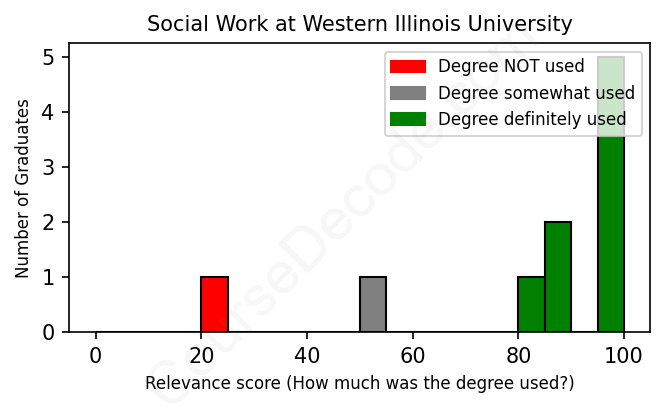 The verdict? Significantly above average. Overall, with an average relevance score of 82%, Social Work graduates from Western Illinois University have a much higher likelihood (+15%) of finding work in this field compared to the average graduate across all fields:
