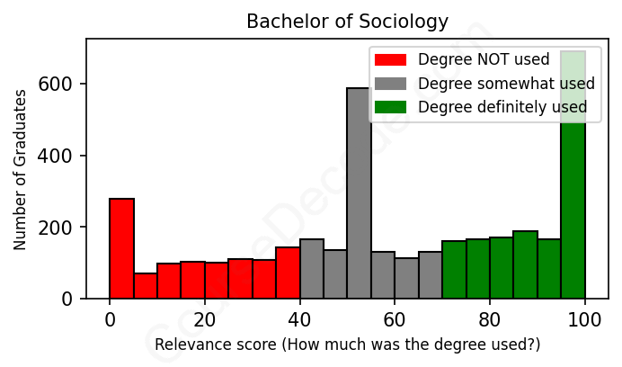 The verdict? Below average. Overall, with an average relevance score of 58%, Sociology graduates have a lower likelihood (-9%) of finding work in this field compared to the average graduate across all fields:
