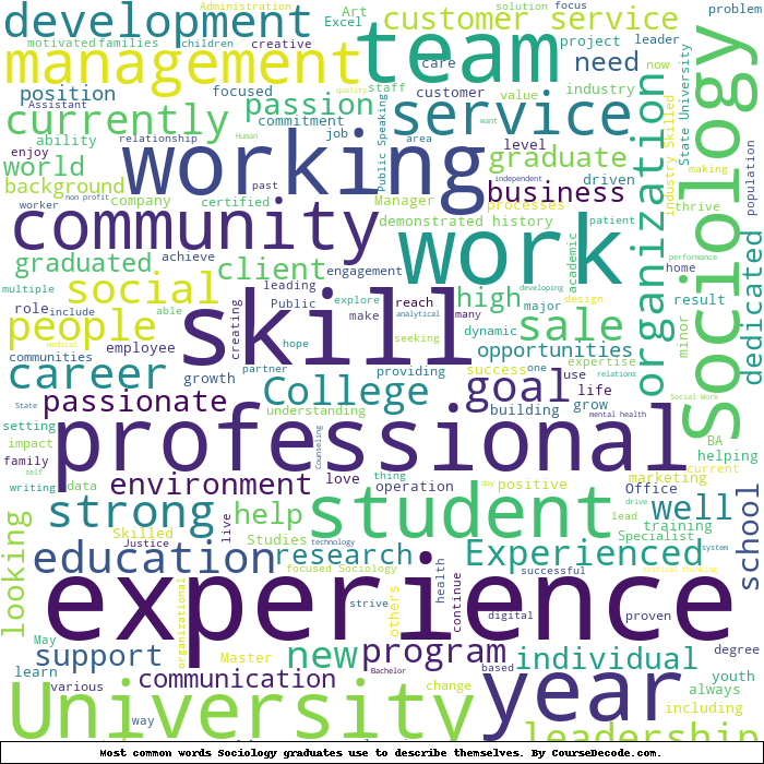 Here is a visual representation of the most common words seen in the "about" section of LinkedIn profiles who have a Bachelor degree in Sociology. This may or may not be useful: