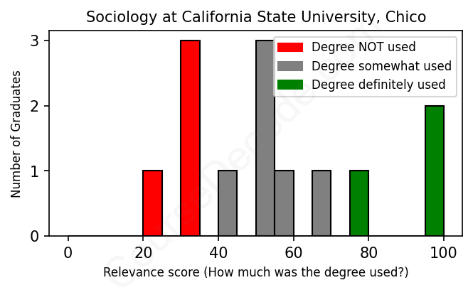 The verdict? Significantly below average. Overall, with an average relevance score of 54%, Sociology graduates from California State University, Chico have a much lower likelihood (-13%) of finding work in this field compared to the average graduate across all fields: