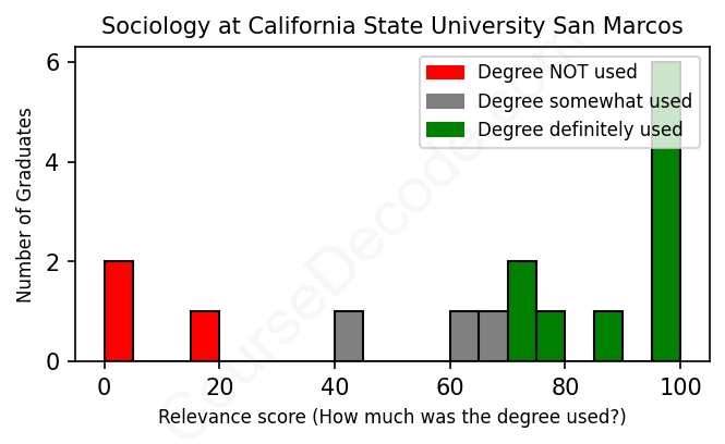 The verdict? Slightly above average. Overall, with an average relevance score of 69%, Sociology graduates from California State University San Marcos have a slightly higher likelihood (+2%) of finding work in this field compared to the average graduate across all fields: