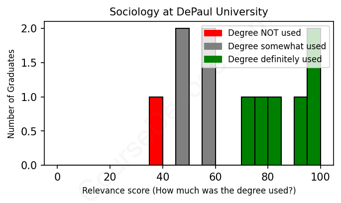 The verdict? Slightly above average. Overall, with an average relevance score of 70%, Sociology graduates from DePaul University have a slightly higher likelihood (+3%) of finding work in this field compared to the average graduate across all fields:
