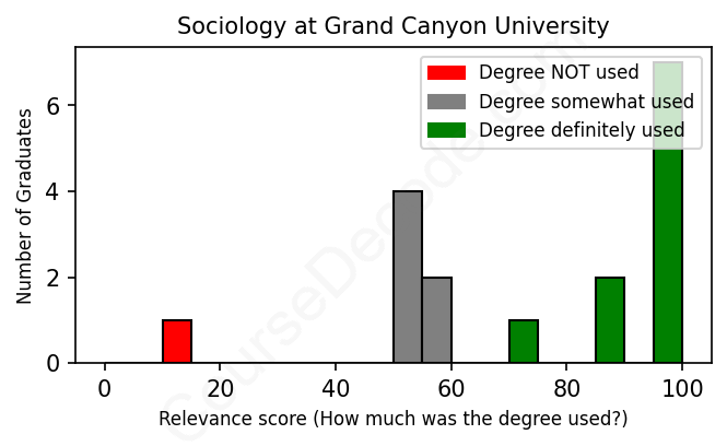The verdict? Above average. Overall, with an average relevance score of 74%, Sociology graduates from Grand Canyon University have a higher likelihood (+7%) of finding work in this field compared to the average graduate across all fields: