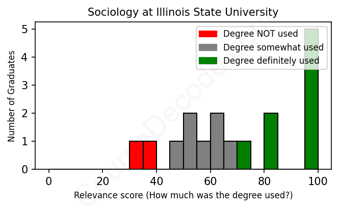 The verdict? Slightly above average. Overall, with an average relevance score of 69%, Sociology graduates from Illinois State University have a slightly higher likelihood (+2%) of finding work in this field compared to the average graduate across all fields: