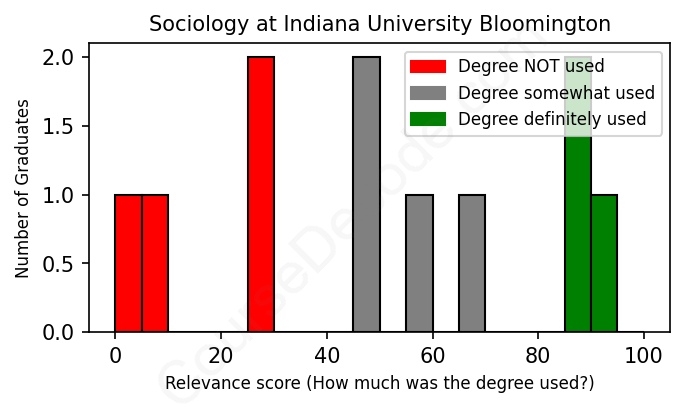 The verdict? Significantly below average. Overall, with an average relevance score of 49%, Sociology graduates from Indiana University Bloomington have a much lower likelihood (-18%) of finding work in this field compared to the average graduate across all fields:
