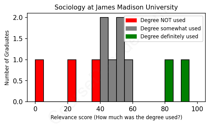 The verdict? Significantly below average. Overall, with an average relevance score of 47%, Sociology graduates from James Madison University have a much lower likelihood (-20%) of finding work in this field compared to the average graduate across all fields: