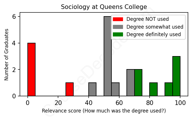 The verdict? Significantly below average. Overall, with an average relevance score of 53%, Sociology graduates from Queens College have a much lower likelihood (-14%) of finding work in this field compared to the average graduate across all fields: