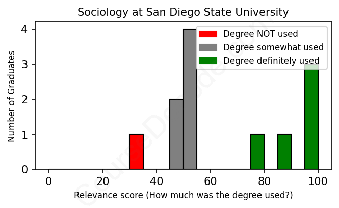The verdict? Slightly below average. Overall, with an average relevance score of 65%, Sociology graduates from San Diego State University have a slightly lower likelihood (-2%) of finding work in this field compared to the average graduate across all fields: