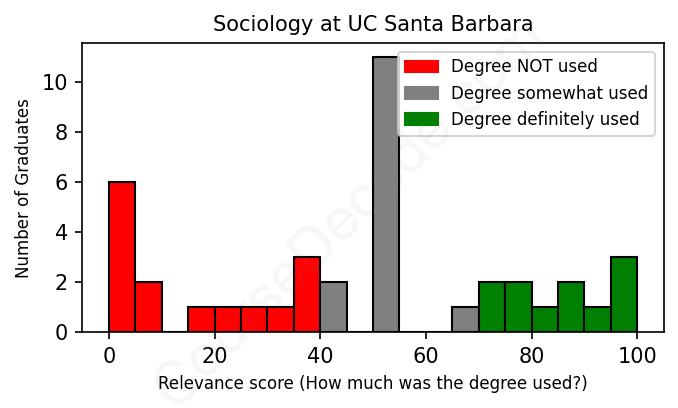 The verdict? Bad. Overall, with an average relevance score of 46%, Sociology graduates from UC Santa Barbara have a substantially lower likelihood (-21%) of finding work in this field compared to the average graduate across all fields: