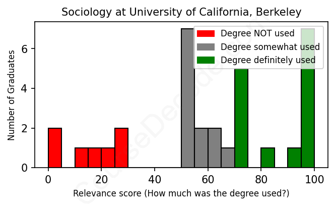 The verdict? Below average. Overall, with an average relevance score of 60%, Sociology graduates from University of California, Berkeley have a lower likelihood (-7%) of finding work in this field compared to the average graduate across all fields: