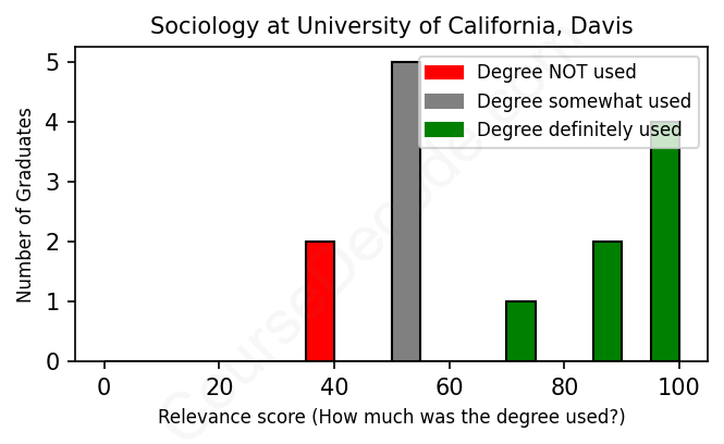 The verdict? Slightly above average. Overall, with an average relevance score of 69%, Sociology graduates from University of California, Davis have a slightly higher likelihood (+2%) of finding work in this field compared to the average graduate across all fields: