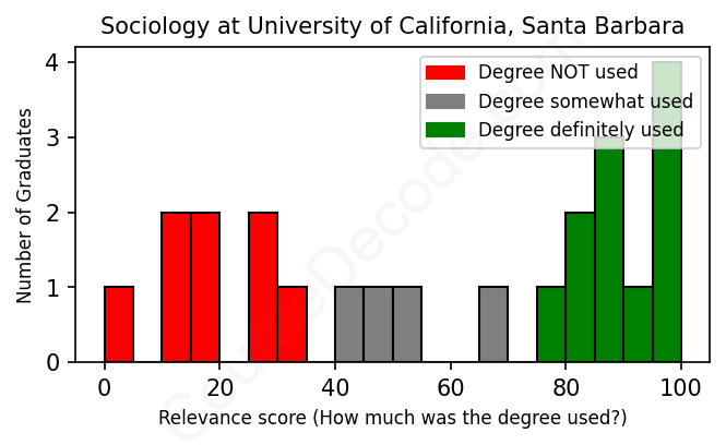 The verdict? Below average. Overall, with an average relevance score of 58%, Sociology graduates from University of California, Santa Barbara have a lower likelihood (-9%) of finding work in this field compared to the average graduate across all fields: