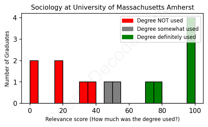 The verdict? Significantly below average. Overall, with an average relevance score of 53%, Sociology graduates from University of Massachusetts Amherst have a much lower likelihood (-14%) of finding work in this field compared to the average graduate across all fields:
