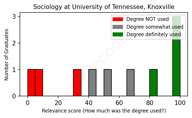 The verdict? Below average. Overall, with an average relevance score of 57%, Sociology graduates from University of Tennessee, Knoxville have a lower likelihood (-10%) of finding work in this field compared to the average graduate across all fields: