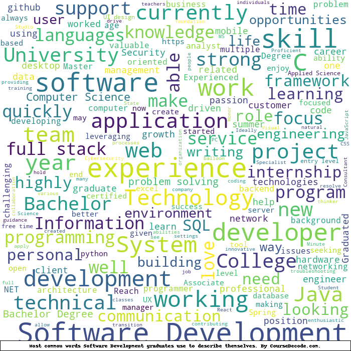Here is a visual representation of the most common words seen in the "about" section of LinkedIn profiles who have a Bachelor degree in Software Development. This may or may not be useful: