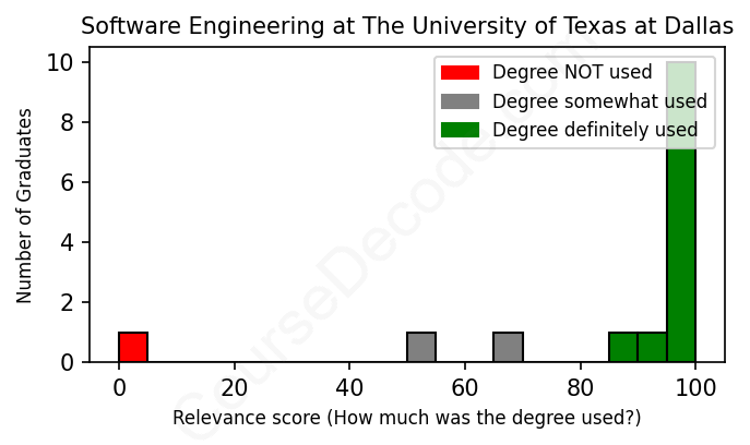 The verdict? Significantly above average. Overall, with an average relevance score of 86%, Software Engineering graduates from The University of Texas at Dallas have a much higher likelihood (+19%) of finding work in this field compared to the average graduate across all fields: