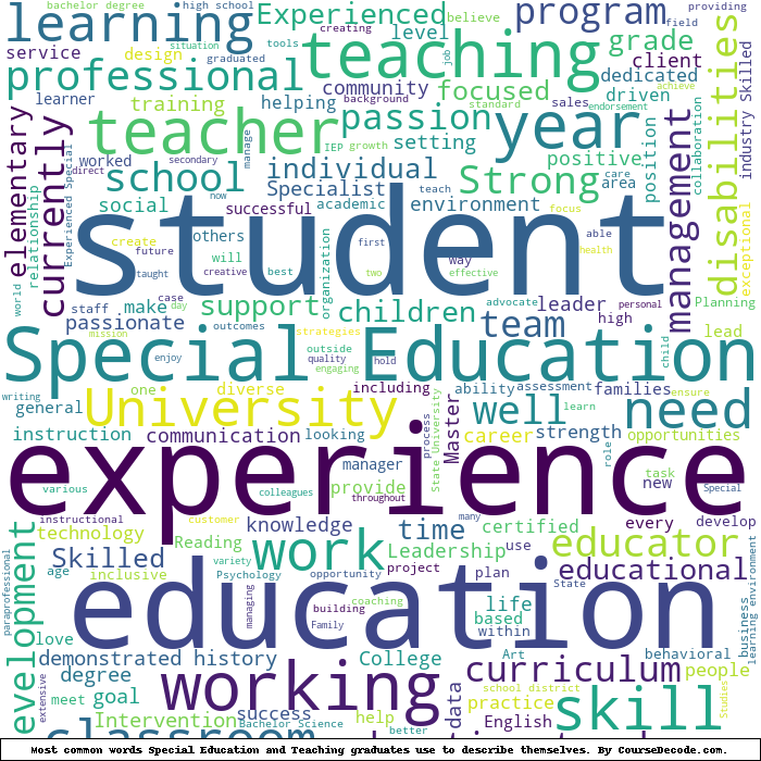 Here is a visual representation of the most common words seen in the "about" section of LinkedIn profiles who have a Bachelor degree in Special Education and Teaching. This may or may not be useful:
