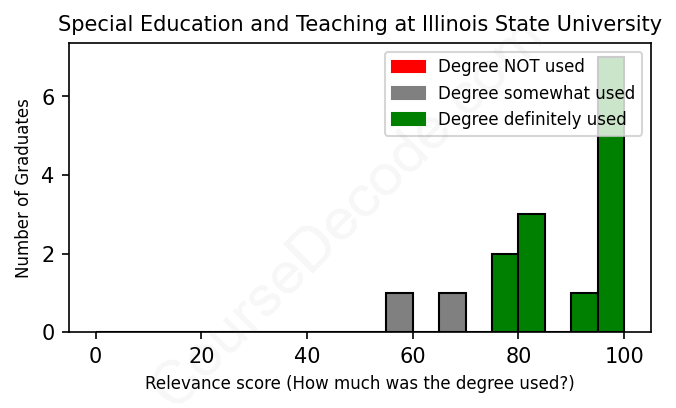 The verdict? Significantly above average. Overall, with an average relevance score of 87%, Special Education and Teaching graduates from Illinois State University have a much higher likelihood (+20%) of finding work in this field compared to the average graduate across all fields: